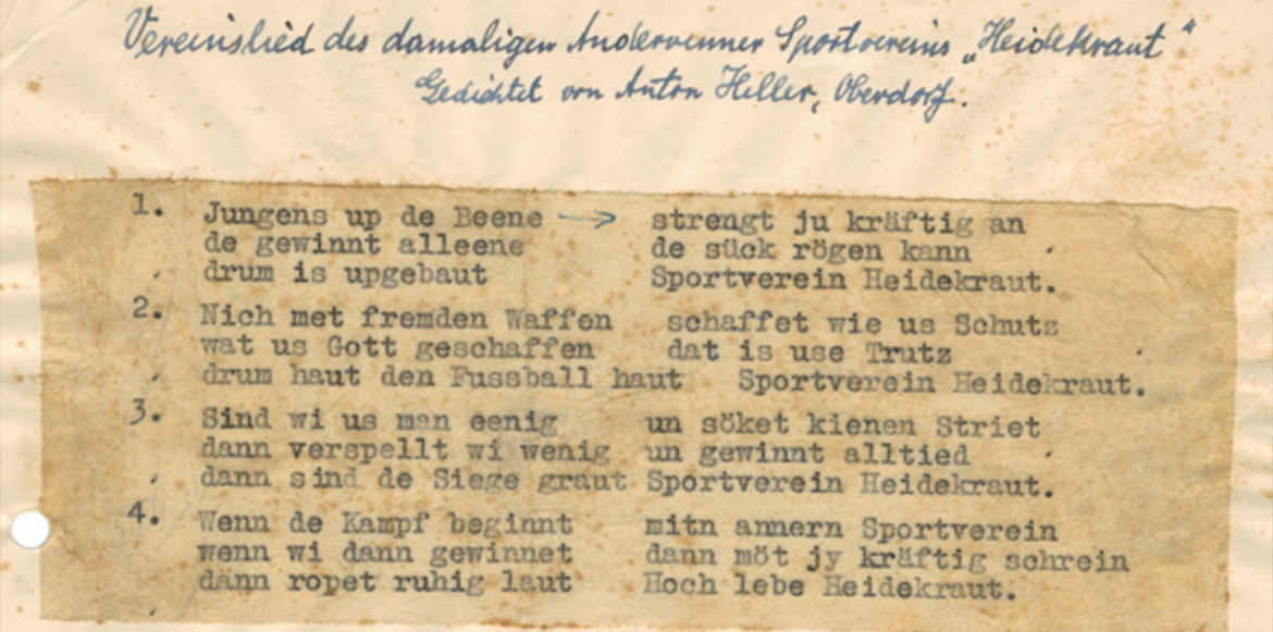 Selbstverständlich gab sich der Sportverein Heidekraut Andervenne ebenfalls eine Satzung; hieraus einige heutzutage amüsant wirkende Passagen, die nicht zuletzt die hohe Stellung der Kirche zu dieser Zeit verdeutlichen: – Sinn und Zweck des Vereines ist die gemeinschaftliche körperliche Ertüchtigung der Gemeindejugend. – Besondere Gründe des Ausschlusses sind: Unehrlichkeit, Fahrlässigkeit, Quertreiberei, Unpünktlichkeit, schlechtes Benehmen und unerlaubtes Mitspielen in anderen Vereinen. – Die religiösen Belange der Jugend werden durch den Vorstand mit dem Herrn Pfarrer geregelt. – Die Spieler haben sich vom Sportausschuss ohne zu murren eingliedern zu lassen; hierbei wird strengste Disziplin verlangt. – Die Auflösung des Vereines kann nur von allen Mitgliedern mit wenigstens Zwei-Drittel-Stimmenmehrheit vollzogen werden. Das vorhandene Kapital und die Wertgegenstände werden in diesem Falle dem Herrn Ortspfarrer zur Verfügung gestellt.